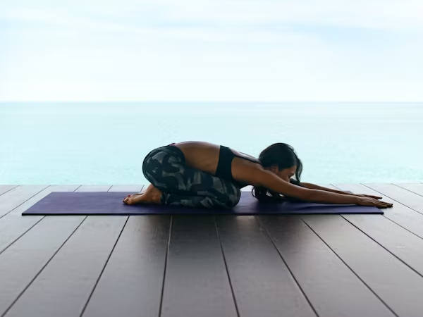 This gentle resting pose relaxes the nervous system, eases fatigue, and reduces anxiety.